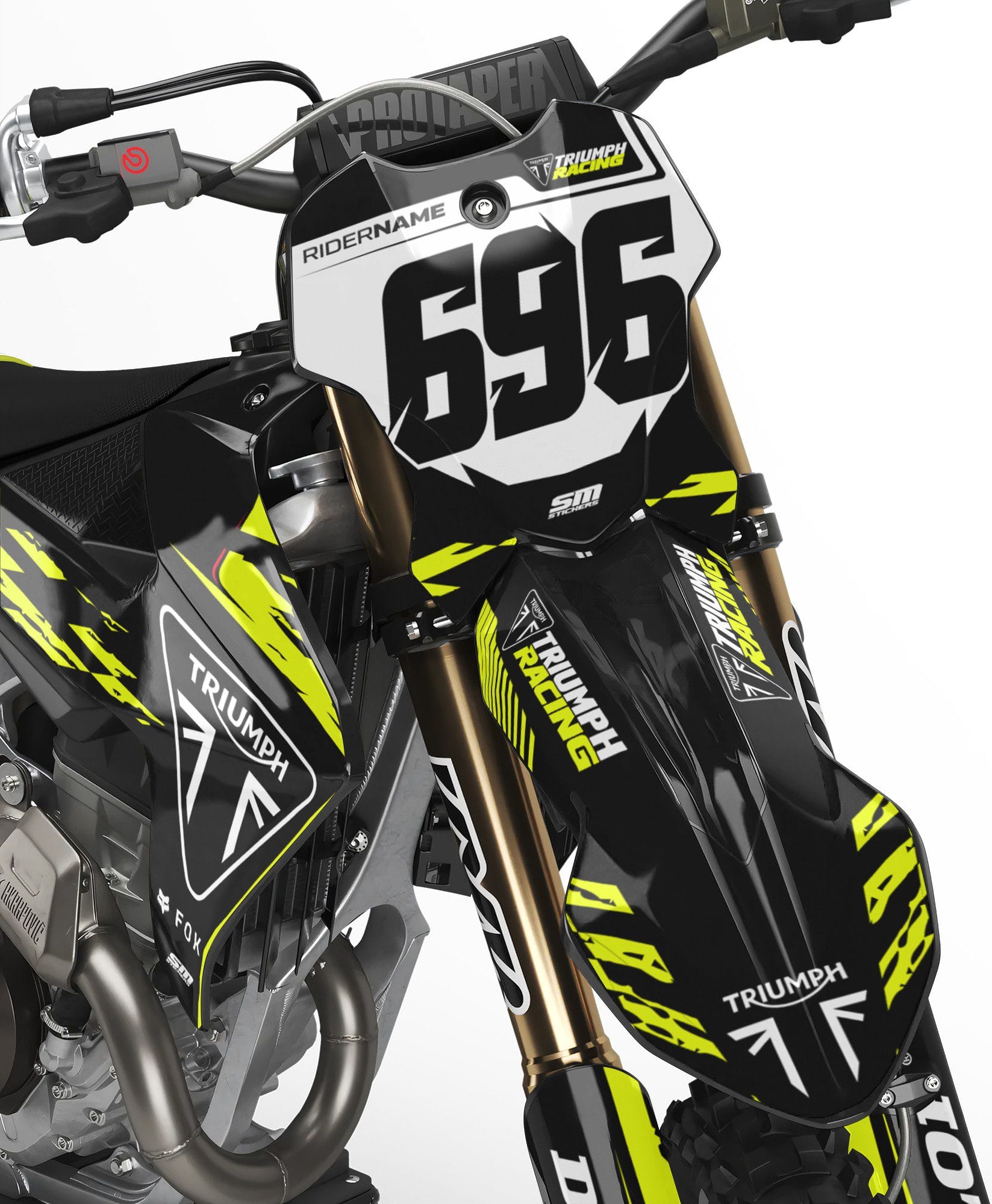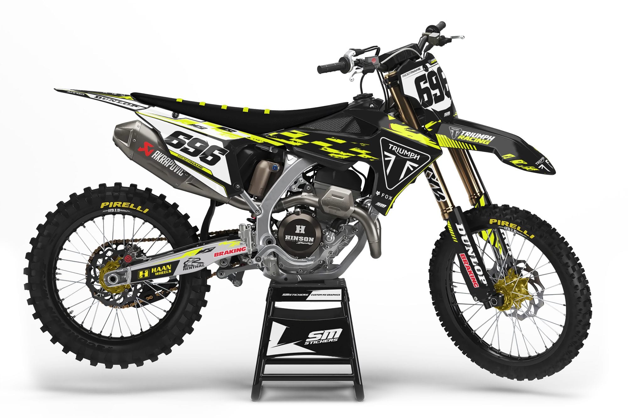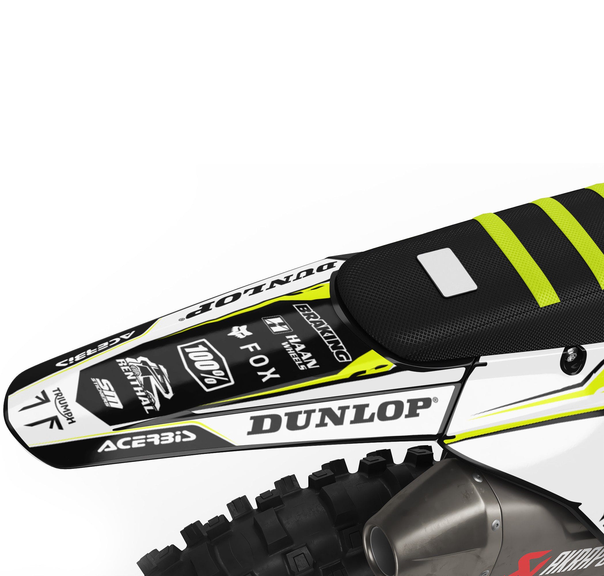 Zestaw zawiera okleinę na: osłony chłodnicy, pola numerowe boczne i przednie, puszkę filtra powietrza, błotniki przód/tył, osłony lag oraz wahacz.