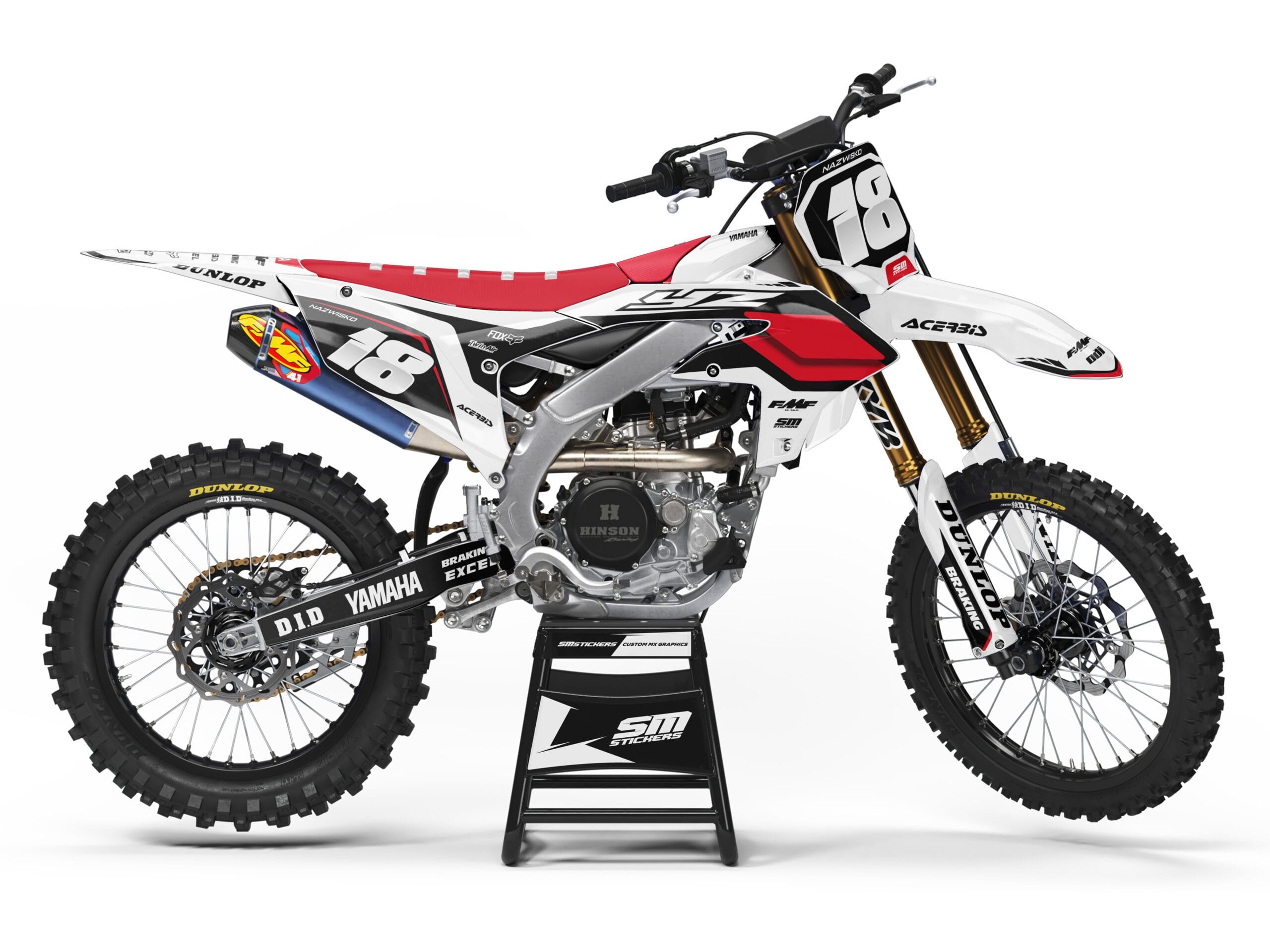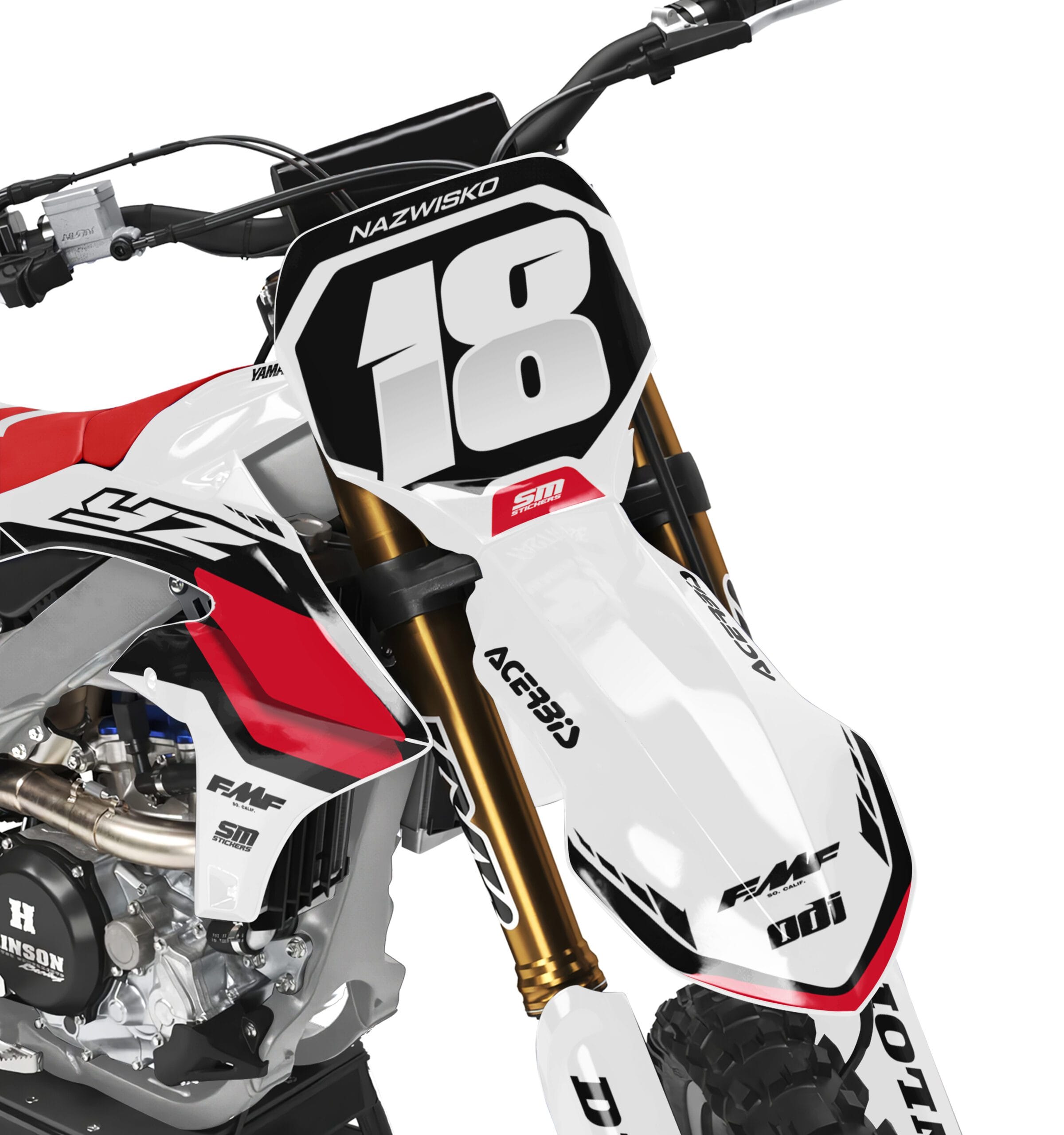 Zestaw zawiera okleinę na: osłony chłodnicy, pola numerowe boczne i przednie, puszkę filtra powietrza, błotniki przód/tył, osłony lag oraz wahacz.
